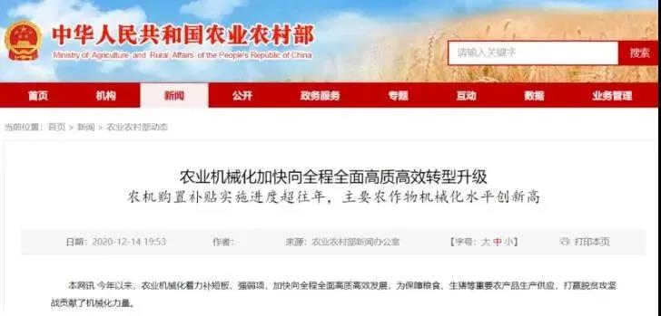 ? ? 農業農村部網站近日消息,今年以來,農業機械化著力補短板、強弱項,加快向全程全面高質高效發展,為保障糧食、生豬等重要農產品生產供應,打贏脫貧攻堅戰貢獻了機械化力量。