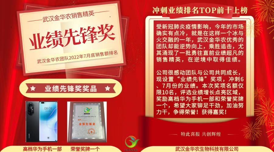 ? ? 公司很感動(dòng)精英團(tuán)隊(duì)與公司共同成長(zhǎng),現(xiàn)設(shè)置“業(yè)績(jī)先鋒”獎(jiǎng)項(xiàng),沖刺6、7月份的業(yè)績(jī)本次獎(jiǎng)項(xiàng)名額僅限10名,評(píng)選業(yè)績(jī)?cè)鲩L(zhǎng)點(diǎn)亮區(qū)域。經(jīng)公司研究決定,特舉辦以下評(píng)選“業(yè)績(jī)先鋒獎(jiǎng)”活動(dòng),業(yè)績(jī)先鋒獎(jiǎng)10名。評(píng)選標(biāo)準(zhǔn)為6-7月份銷售額前十名,榮譽(yù)獎(jiǎng)品:高檔華為手機(jī)一部 、榮譽(yù)獎(jiǎng)牌一個(gè)。