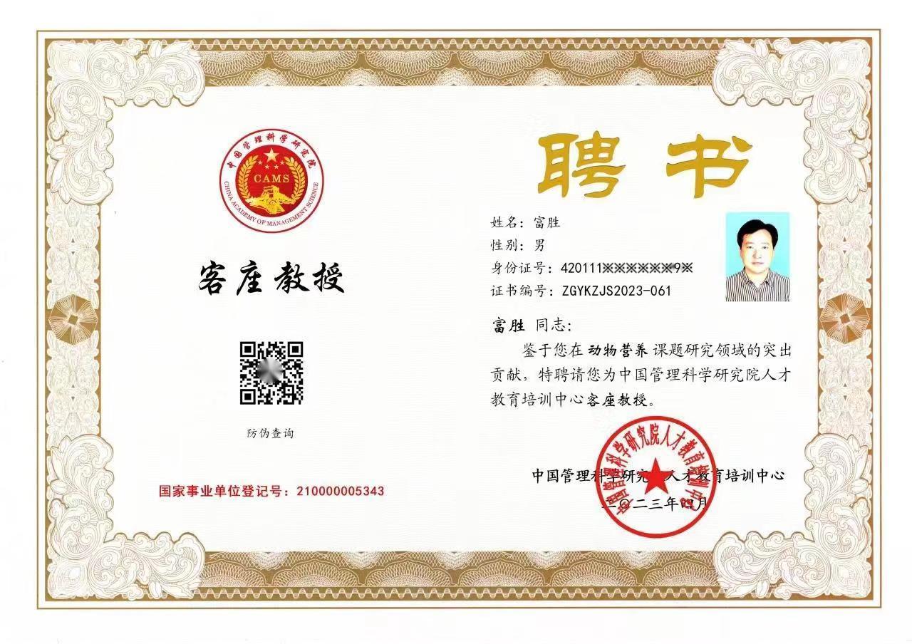 中國科學研究院“動物營養”榮譽證書