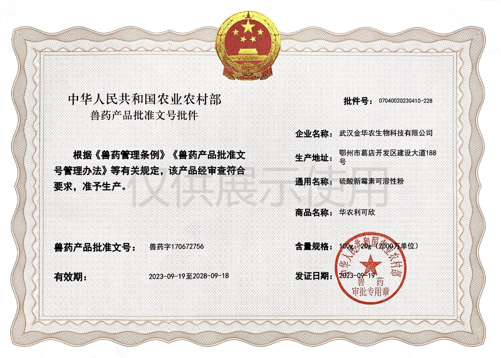 近日,我司申報的新獸藥“華農感康靈”(荊防敗毒散)、“華農利可欣”(20%硫酸新霉素可溶性粉)正式獲批,并獲得國農業農村部頒發的新獸藥產品批準文號批件。