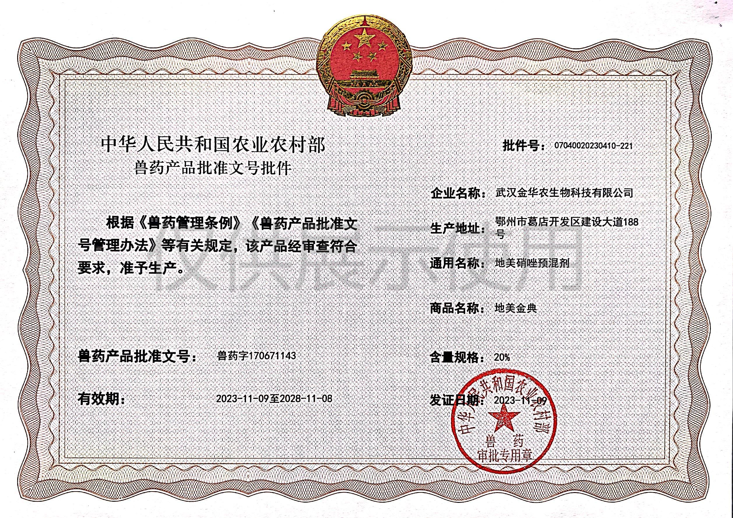 ? ? ??根據(jù)《獸藥管理條例》和《獸藥產(chǎn)品批準(zhǔn)文號管理辦法》的規(guī)定,經(jīng)農(nóng)業(yè)農(nóng)村部審查,準(zhǔn)予核發(fā)武漢金華農(nóng)生物科技有限公司2個新版GMP獸藥相關(guān)產(chǎn)品批準(zhǔn)文號。