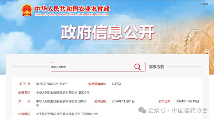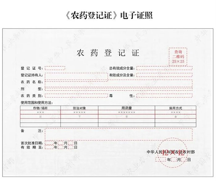 一、自2024年11月1日起,在全國范圍內推行應用農業農村部本級頒發的《農藥登記證》、《農藥登記試驗單位證書》、《肥料登記證》、《獸藥產品批準文號批件》、《國(境)外引進農業種苗檢疫審批單》共5種電子證照。電子證照與紙質證照同步制發、并行使用,具有同等法律效力。自2025年1月1日起,不再制發相應的紙質證照。