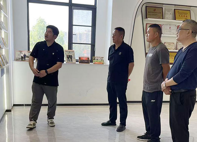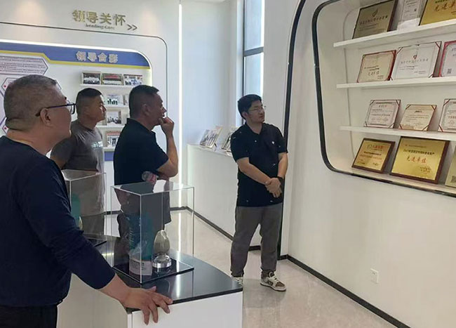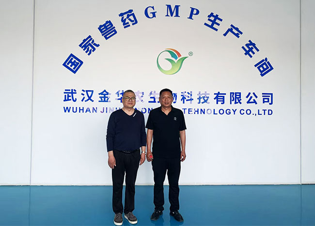 在公司技術研發總監姚教授、運營部郭總的陪同下,張總一行首先參觀了位于葛店經濟技術開發區的現代化生產基地。該基地于 2024 年完成二期擴建,新增水產漁藥專用生產線 8 條,涵蓋消毒劑、殺蟲劑、微生態制劑等全品類。在智能化車間,張總、史總、以及團隊詳細了解了“漁康金諾”、“出血菌炎凈”、 “車指安”、“水霉凈” 等新品的生產工藝,對公司通過化藥中草藥“高含量納米技術、長效干擾素技術、靶向緩釋技術”等技術提升產品效能的創新路徑給予高度評價。