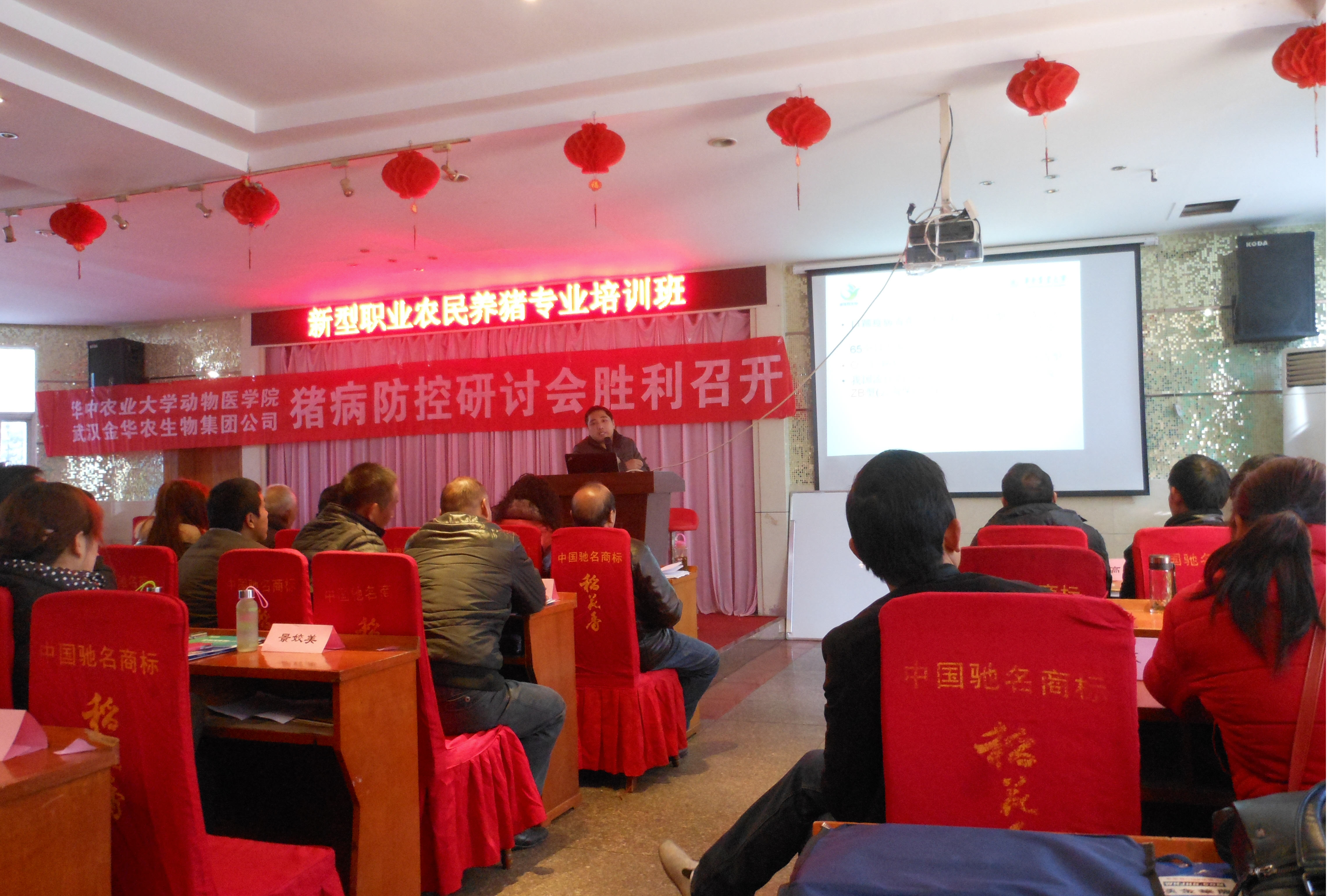 12月13日,受湖北省應城市畜牧獸醫局的邀請,武漢金華農生物公司聯合華中農業大學動物醫學院相關專家,進駐應城市養殖密集示范區,開展“新型職業農民養豬專業培訓班”系列講座,為當地500多家規模化養殖場進行豬病診斷、常見病防治、飼養管理、用藥組合等專業培訓,培訓班取