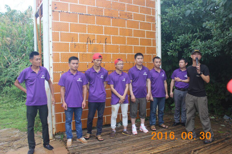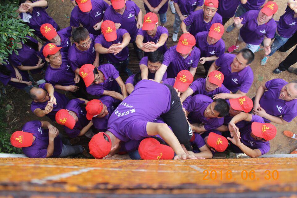 “金華農(nóng),加油!金華農(nóng),加油!金華農(nóng),必勝!金華農(nóng),必勝!……”踏著李奔、陳維利、劉傳忠、曹玉廣、唐友琦、王海峰、陳進(jìn)調(diào)組成的第一層、第二層“人梯”,我們的團(tuán)隊(duì)開(kāi)始往上爬,風(fēng)雨交加,墻面很滑,踩過(guò)兩道“人梯”,公司綜合辦主任黃凡第一個(gè)躍過(guò)墻面,回過(guò)頭來(lái),他開(kāi)始構(gòu)建“頂層”防線,一個(gè)、兩個(gè)、三個(gè)……越來(lái)越多的人在隊(duì)友的幫助下,成功翻越,我們的目標(biāo),是不落一人。