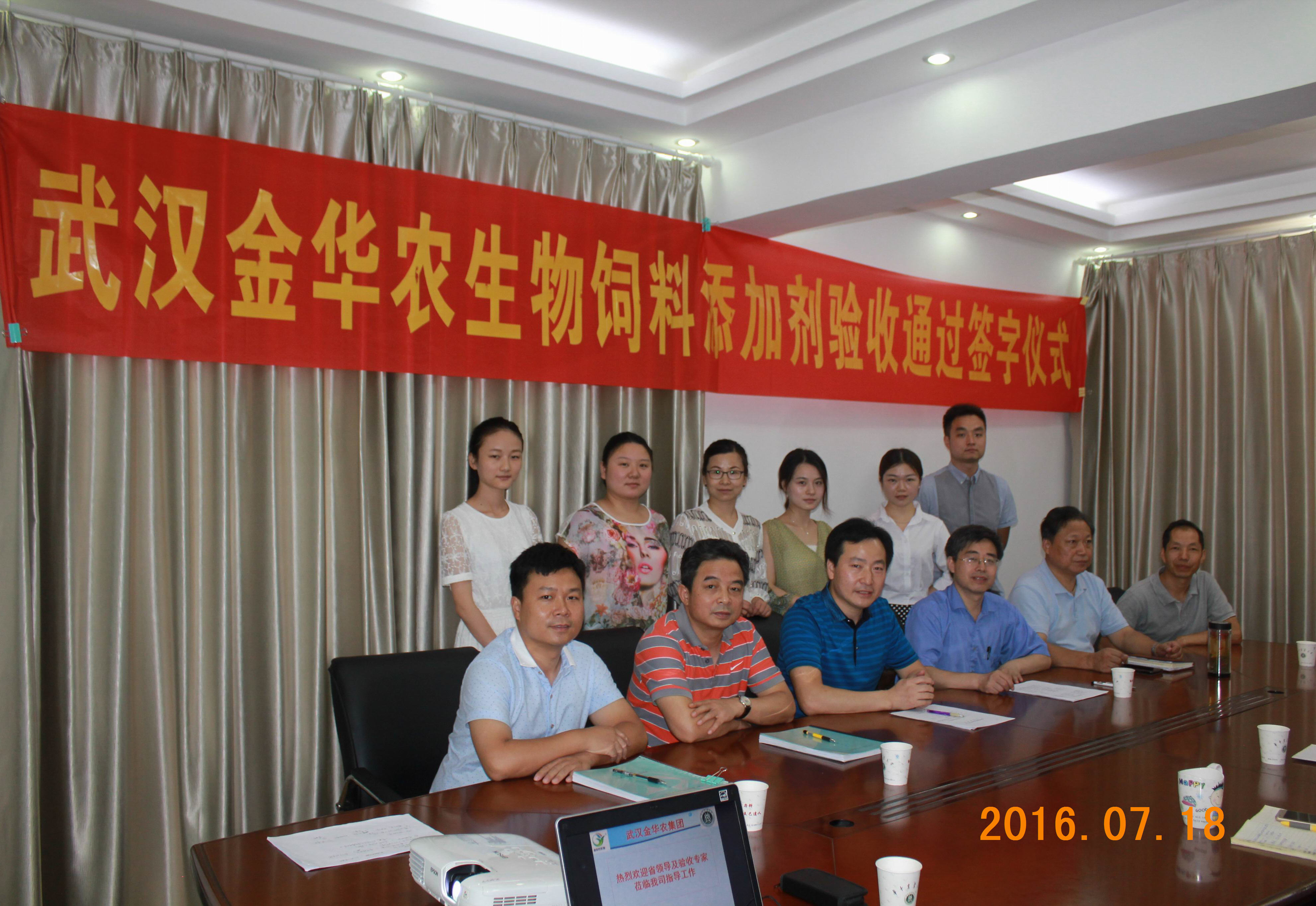 2016年7月18日,湖北省農業廳黃倩蓉處長、武漢市農業局戴紅安局長、湖北省飼料添加劑驗收專家組齊德生教授、牛智友教授一行5人,蒞臨我公司華中農業大學科技園生產基地視察指導工作,對5年期滿的飼料添加劑(含微生物制劑)的生產線進行復檢驗收,武漢金華農生物獲得高分并一次性通過,每個驗收指標都得到了畜牧局、飼料辦主管領導和各位專家的高度肯定與贊揚。
