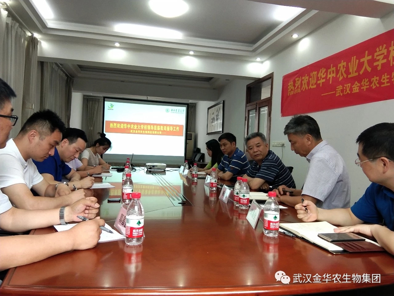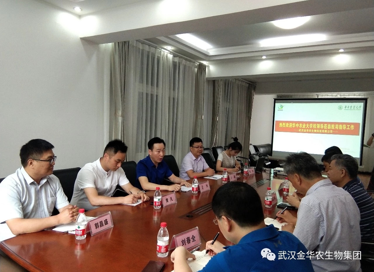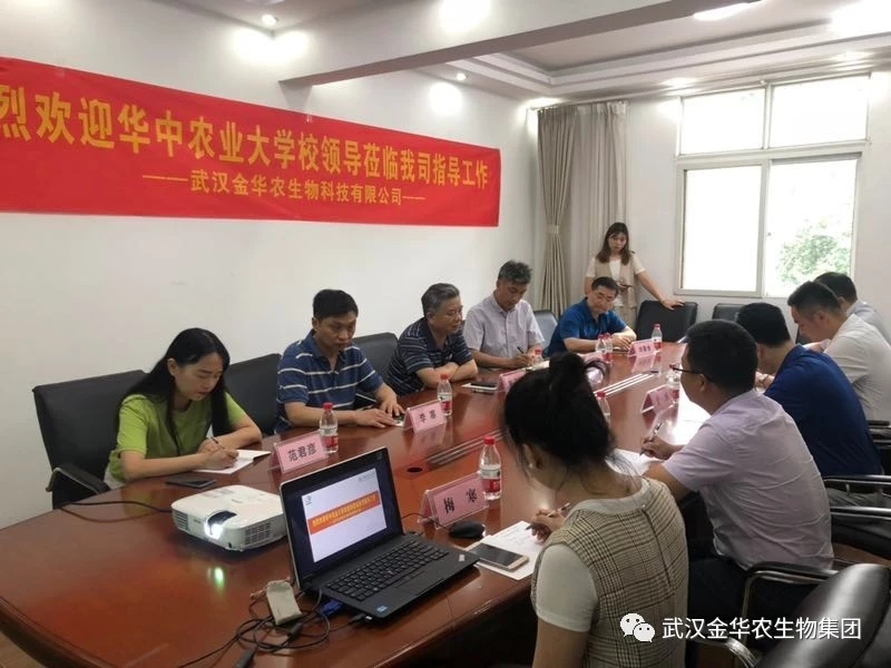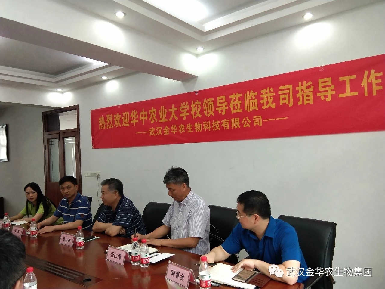 2019年6月12日,華中農(nóng)業(yè)大學(xué)黨委副書記、副校長姚江林,華中農(nóng)業(yè)大學(xué)資產(chǎn)經(jīng)營與后勤保障部部長李寒,華中農(nóng)業(yè)大學(xué)校友與基金工作辦公室主任楊仁海,華中農(nóng)業(yè)大學(xué)資產(chǎn)經(jīng)營與后勤保障部副部長劉春全,一行4人蒞臨武漢金華農(nóng)生物科技有限公司,就雙方深入開展校企聯(lián)合等工作進(jìn)行會(huì)談交流。