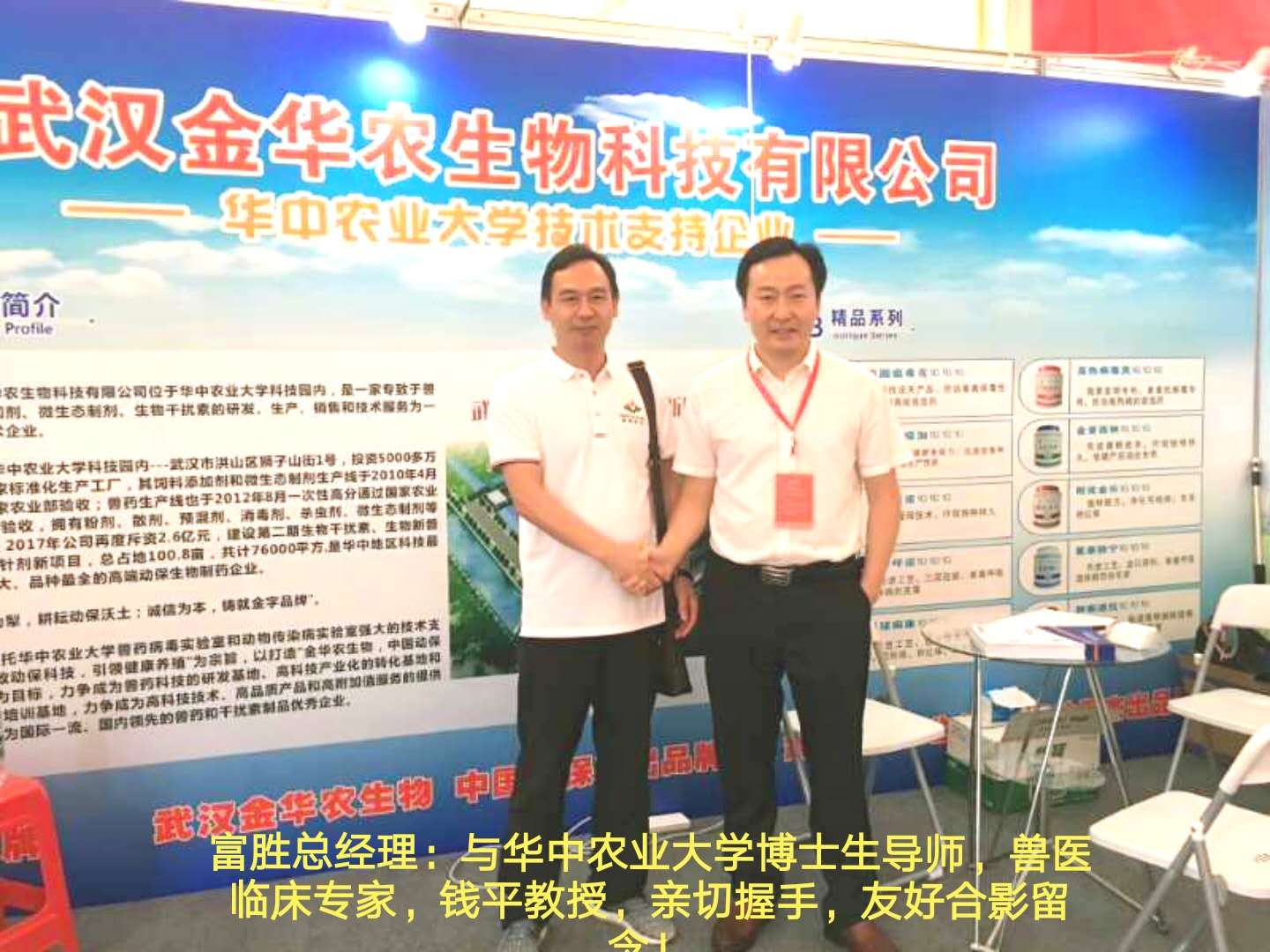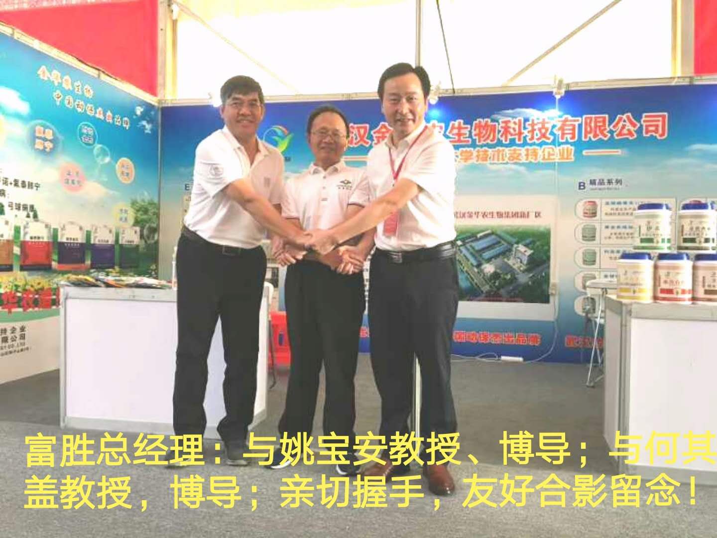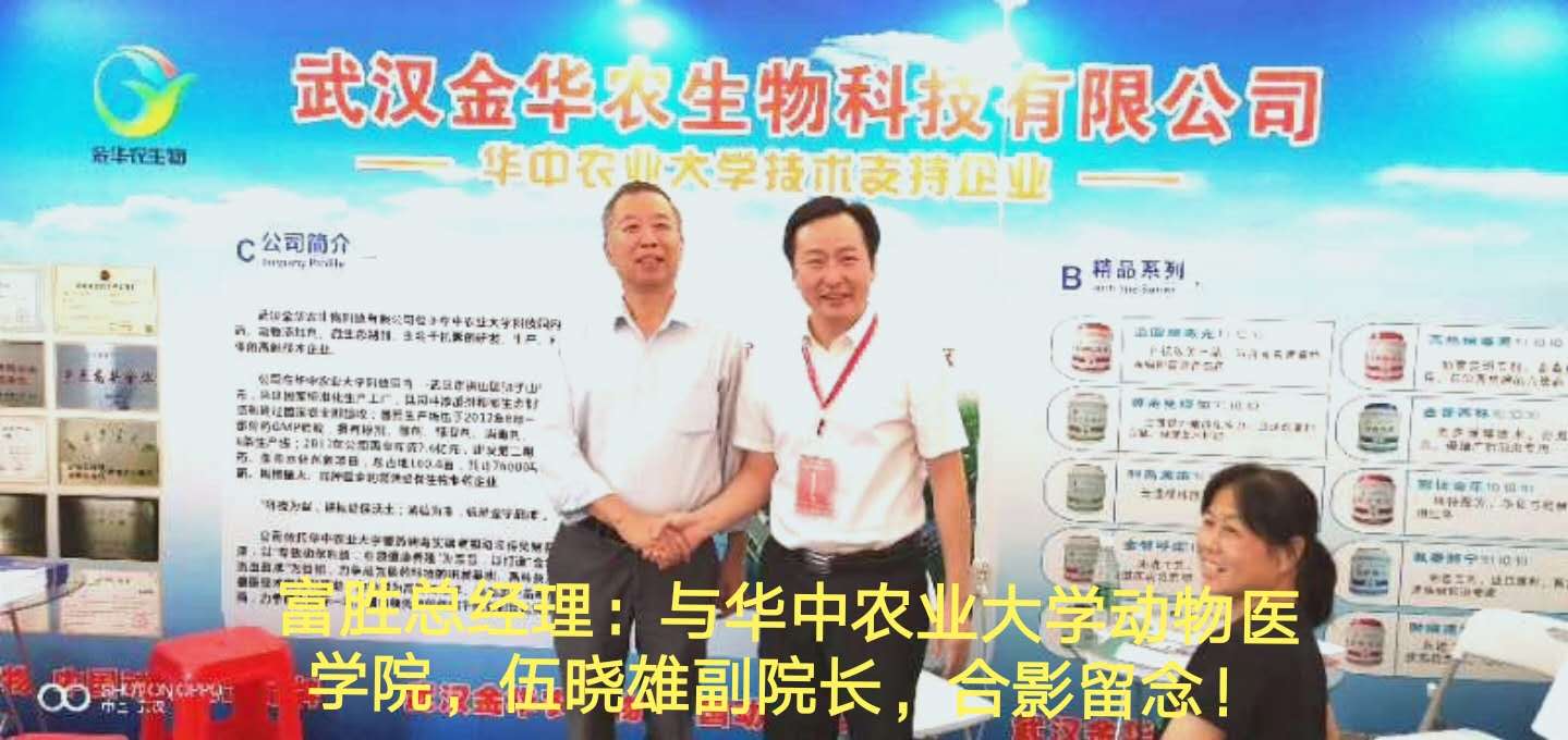 熱烈歡迎華中農業大學三位博士生導師、有影響力學者、獸醫臨床專家,姚寶安教授,何其蓋教授,錢平教授,蒞臨武漢金華農生物集團所在的校友企業品牌展示區,友好交談,達成共識,合影留念!
