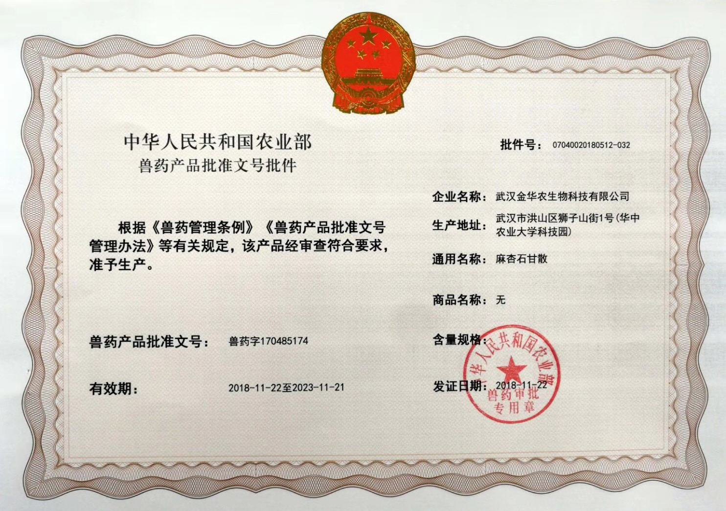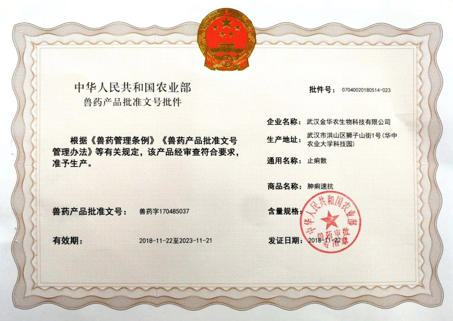 喜訊:2018年12月4日,武漢金華農生物首批“新獸藥”申報的批文批號,獲得國家農業農村部認可,正式頒發批文批件和榮譽證書!感謝社會各界同仁與養殖朋友們對我司的長期信任、支持與贊美!感謝行業各級主管單位對我司的大力支持與肯定!感謝全體武漢金華農人的辛勤付出與努力拼搏!公司為你們感到無比驕傲,和自豪!武漢金華農的明天必定更加精彩和輝煌!