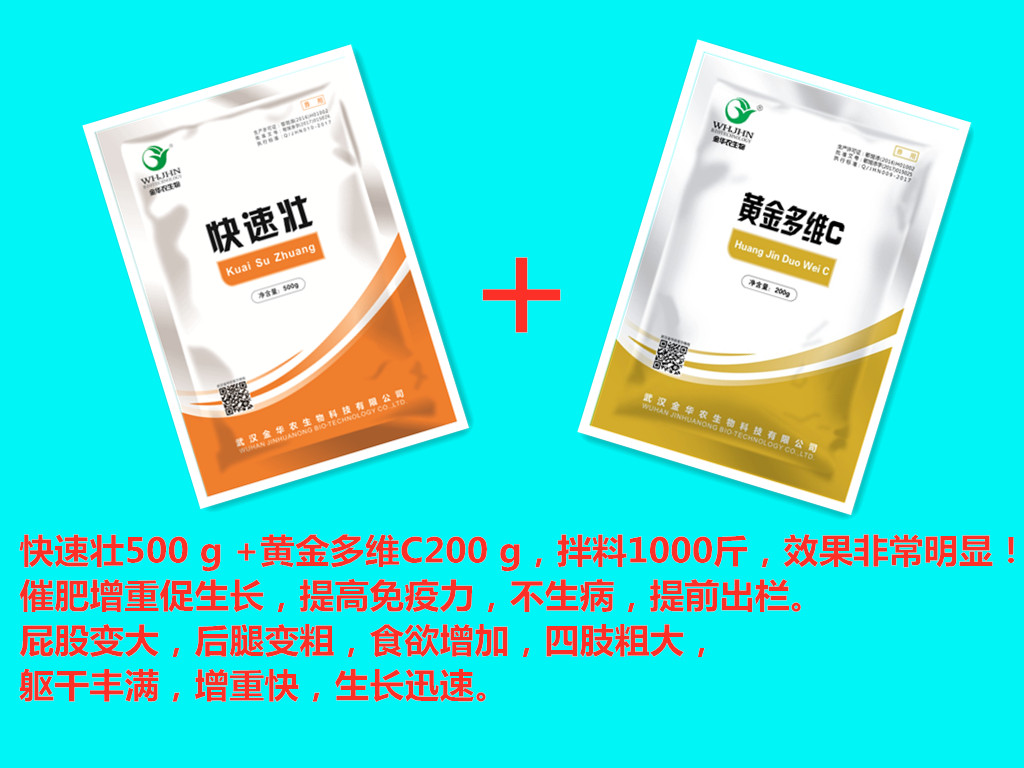 豬,催肥增重促生長,提高免疫力,不生病,提前出欄,從開口吃料開始飼喂,一直到出欄為止,皮紅毛亮,屁股變大,后腿變粗,食欲增加,四肢粗大,軀干豐滿,增重快,生長迅速,多長20斤肉,至少提前15-20天出欄,肉質鮮美,口感好:快速壯500 g +黃金多維C200 g,拌料1000斤,效果非常明顯!