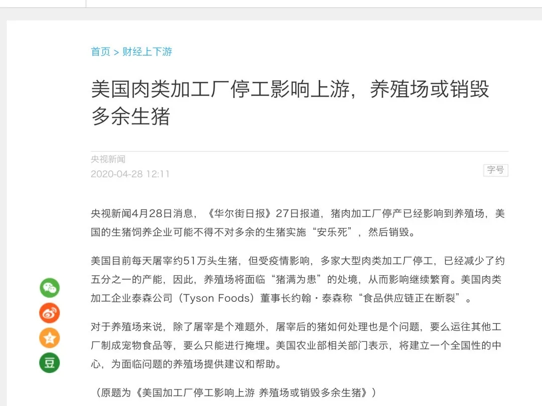 ???????受疫情影響,全美的肉類供應(yīng)量減少了三分之一,全球也恐面臨肉類短缺,部分國(guó)家自顧無(wú)暇,中國(guó)的豬肉進(jìn)口或?qū)⑹艿接绊憽?/span>